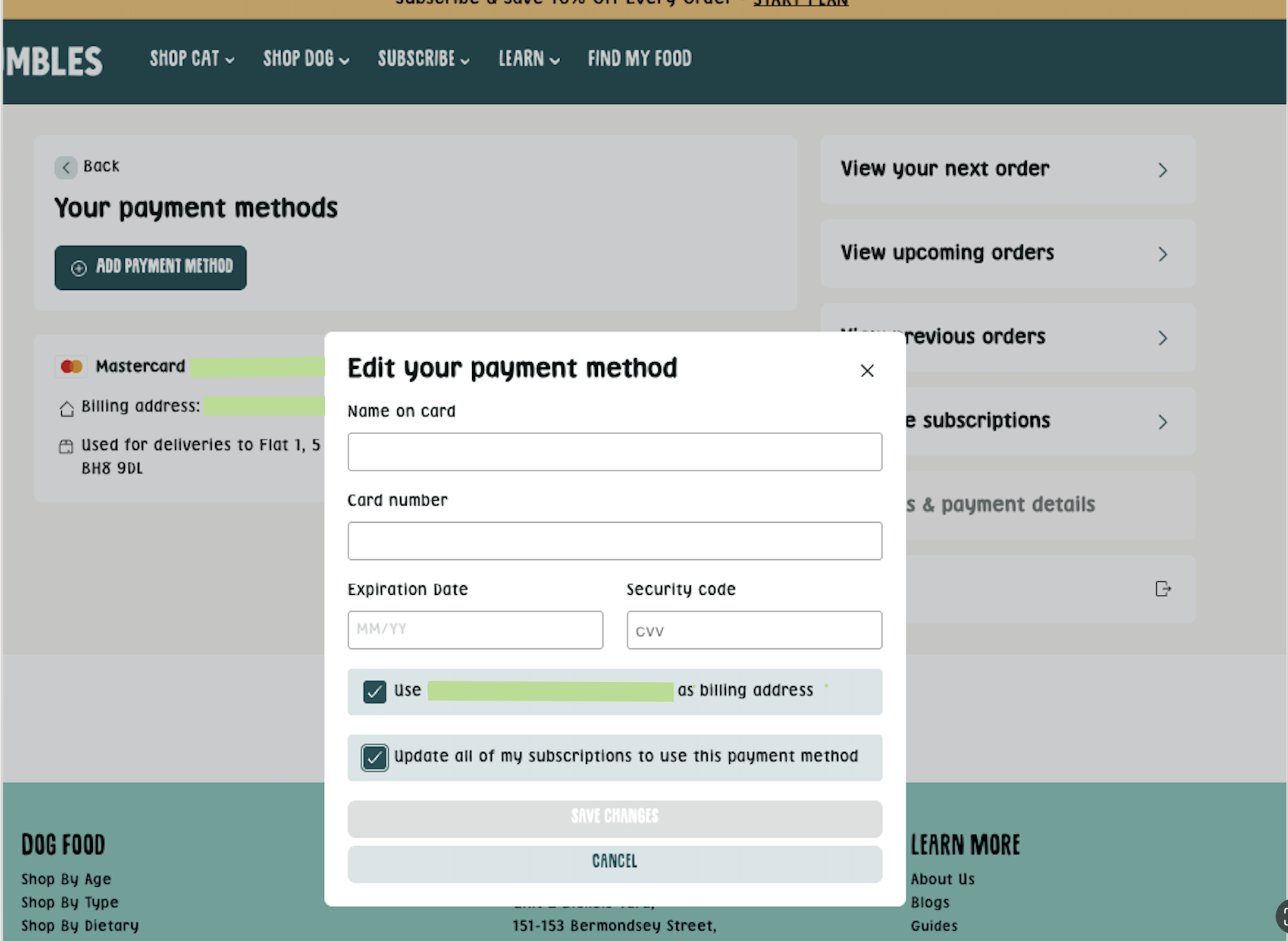 5. Click Save Changes and update your card details. You can also select if you want to change the billing address or use the new details to update the remainder of your subscription.